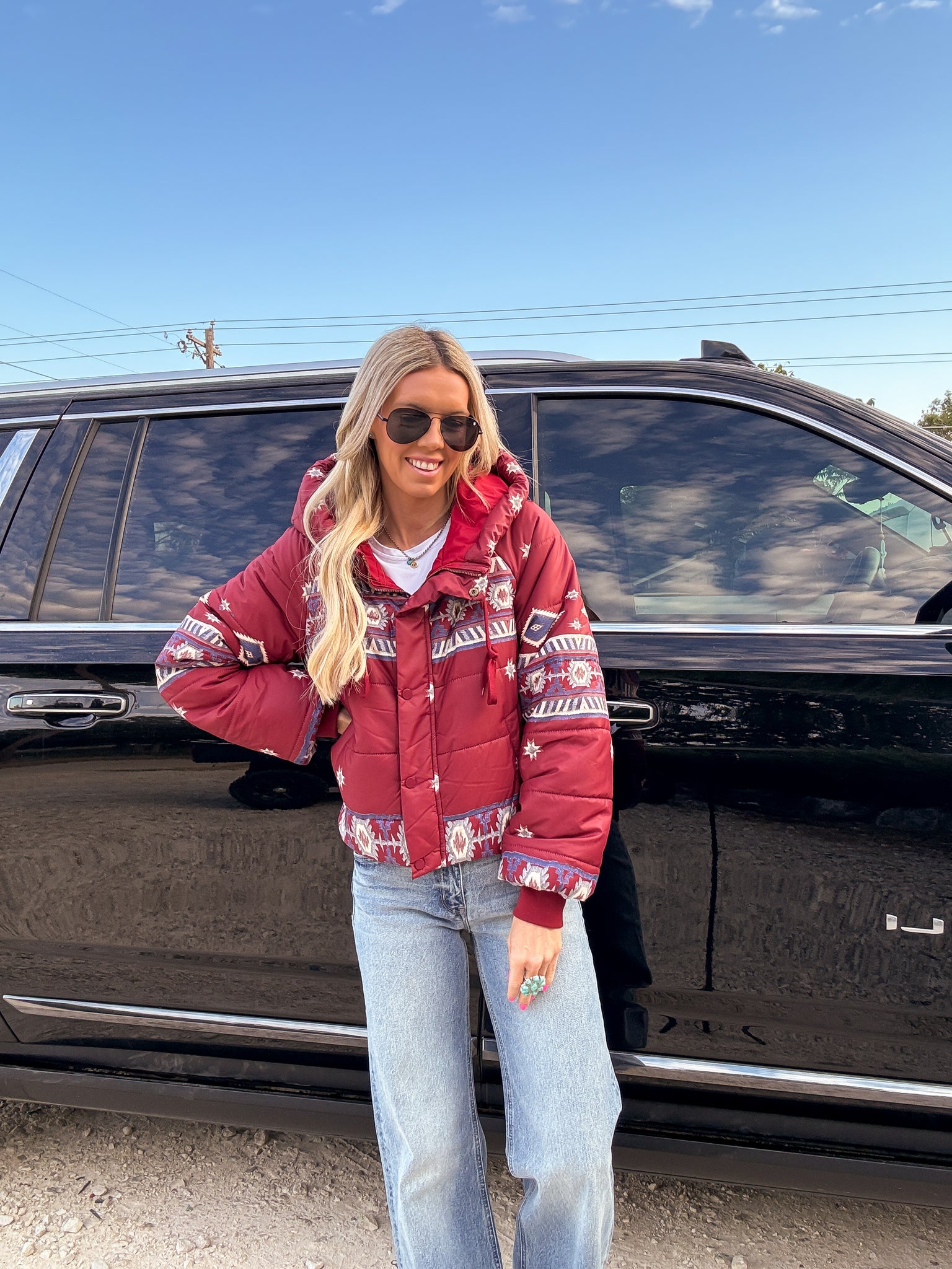 The Atlee Aztec Puffer Jacket combines warmth and style with its Aztec-inspired embroidery and practical design features. This lined jacket includes a front zip closure complemented by snap buttons for secure wear. Equipped with a drawstring hoodie, fitted cuffs, and an elastic drawstring hem, it offers customizable comfort in cold weather. Functional pockets.
