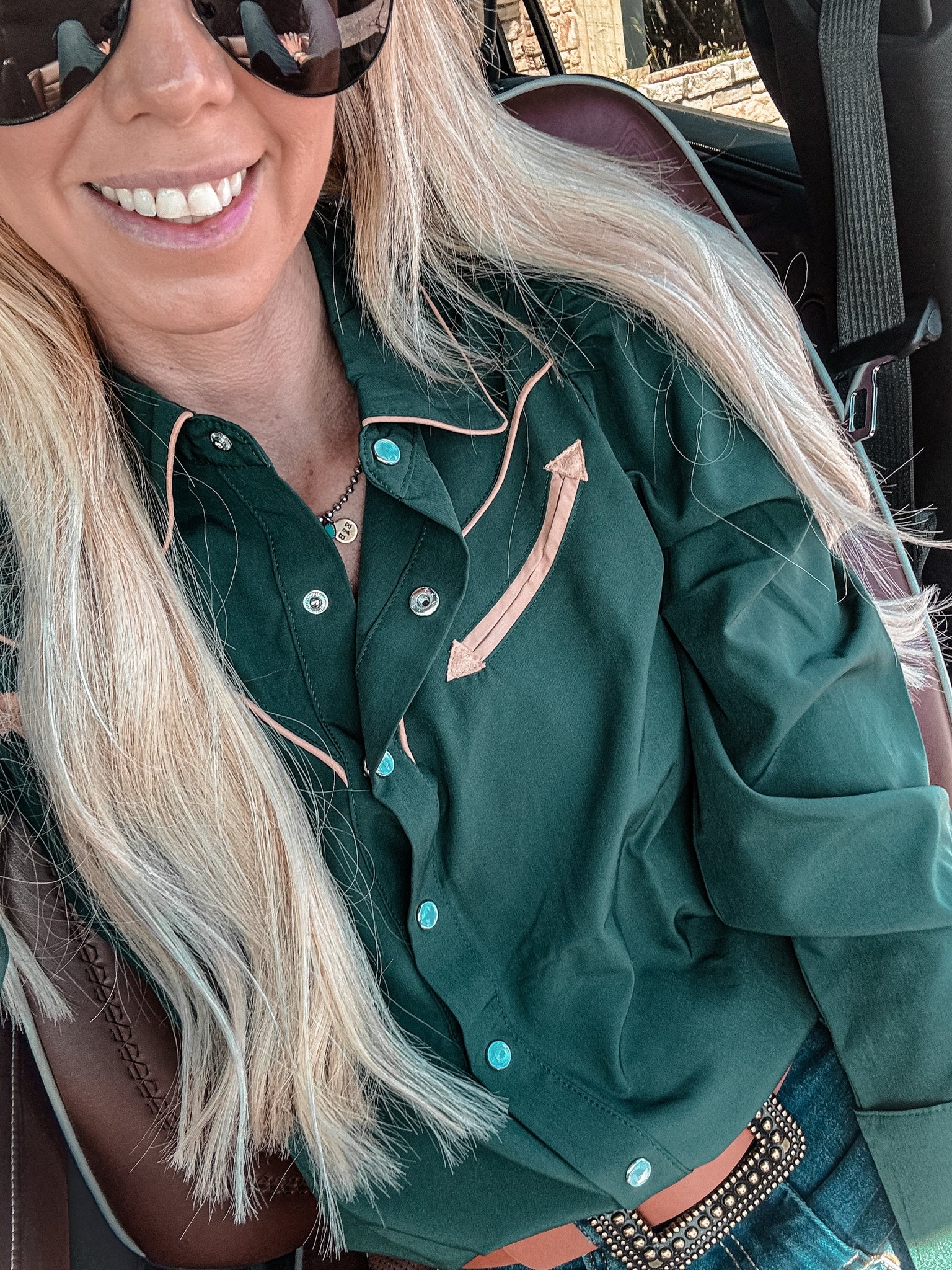 Experience refined comfort with this Silk Button Down in Hunter green. Crafted from silky-soft fabric, this shirt features elegant pearl snap closures and distinctive western arrow detailing on the shoulders, blending classic sophistication with subtle western flair. Perfect for those seeking a polished yet unique wardrobe staple.