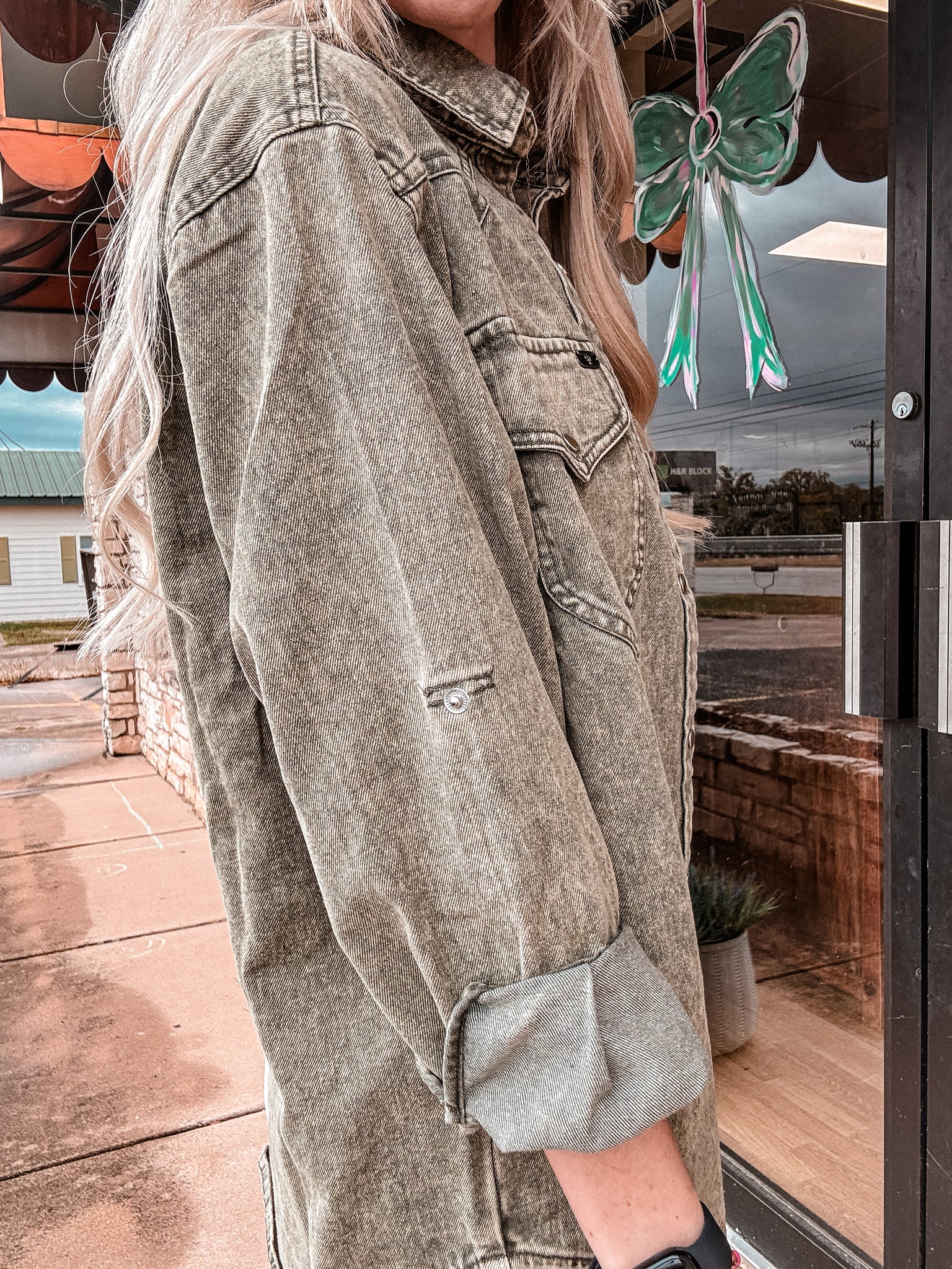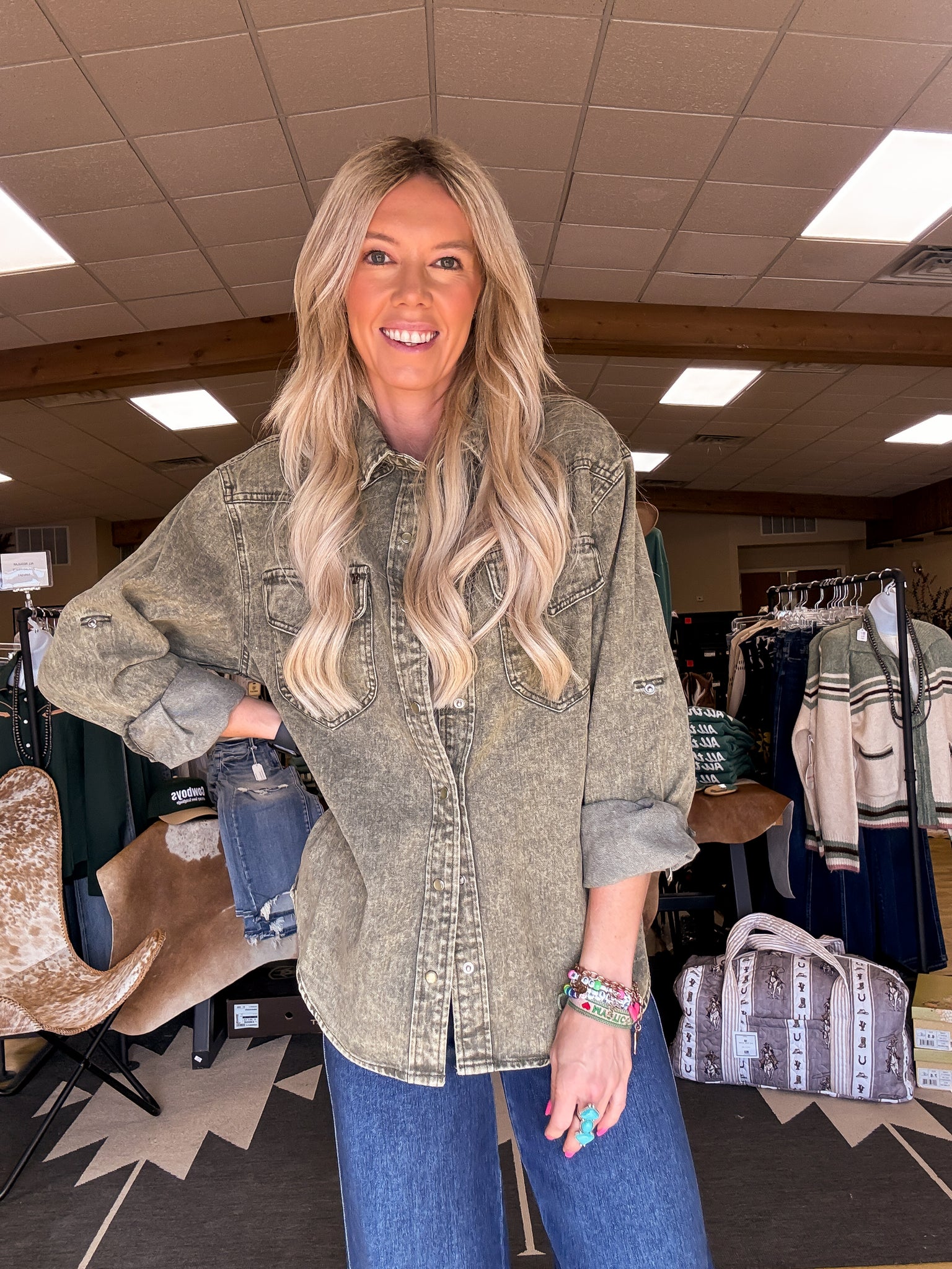 This mineral-washed denim shirt delivers authentic western style with a contemporary edge. Constructed with a soft yet structured fabric that mimics classic denim quality, it features a snap button front, flap chest pockets, and the signature western yoke detailing on both front and back. Long sleeves with button cuffs provide versatility for layering or rolling, while the relaxed, slightly oversized silhouette offers comfortable movement without sacrificing shape.